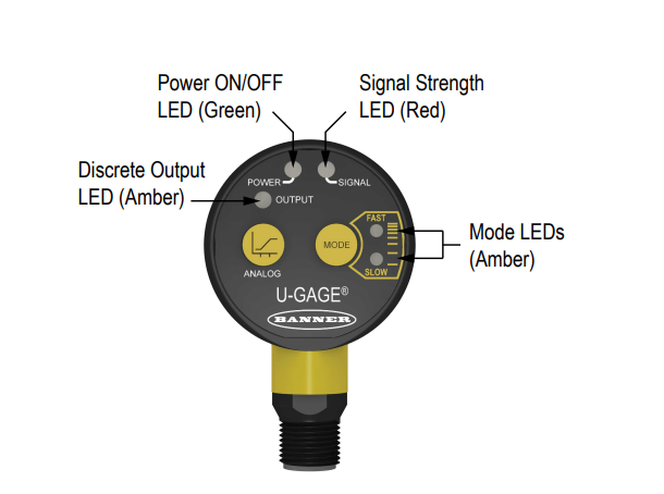 The U-GAGE® T30UX is an easy-to-use ultrasonic sensor with extended range and built-in temperature compensation. Simple push button configuration provides flexibility for a variety of applications. Easy-to-see indicator LEDs communicate the status of the sensor. The Green “Power” LED ON indicates that the sensor is in Run Mode (the sensor’s normal operating condition). The Red “Signal” LED indicates the target signal strength. The Amber “Output” LED indicates that the output is enabled and the sensor is receiving a signal within the window limits. The Amber “Mode” LED indicates the currently selected mode(fast or slow).